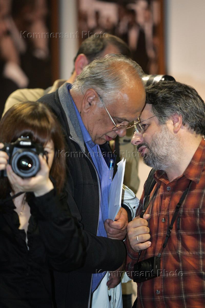 Фотограф Владимир Мусаэльян (слева) и бильдредактор Издательского Дома "КоммерсантЪ" Сергей Шахиджанян (справа) на церемонии открытия выставки фотографа Дмитрия Азарова "Удвоение ВВП". Выставка прошла в Башне Федерации.