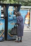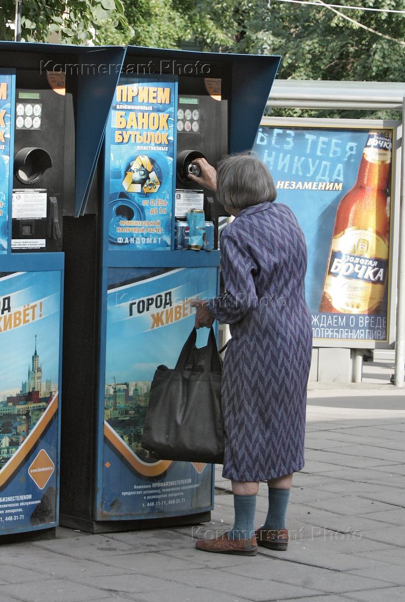Жанровая фотография. Пожилая женщина у автомата приема банок и бутылок.