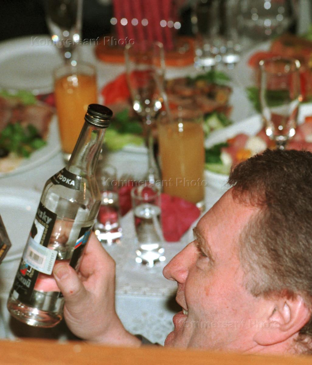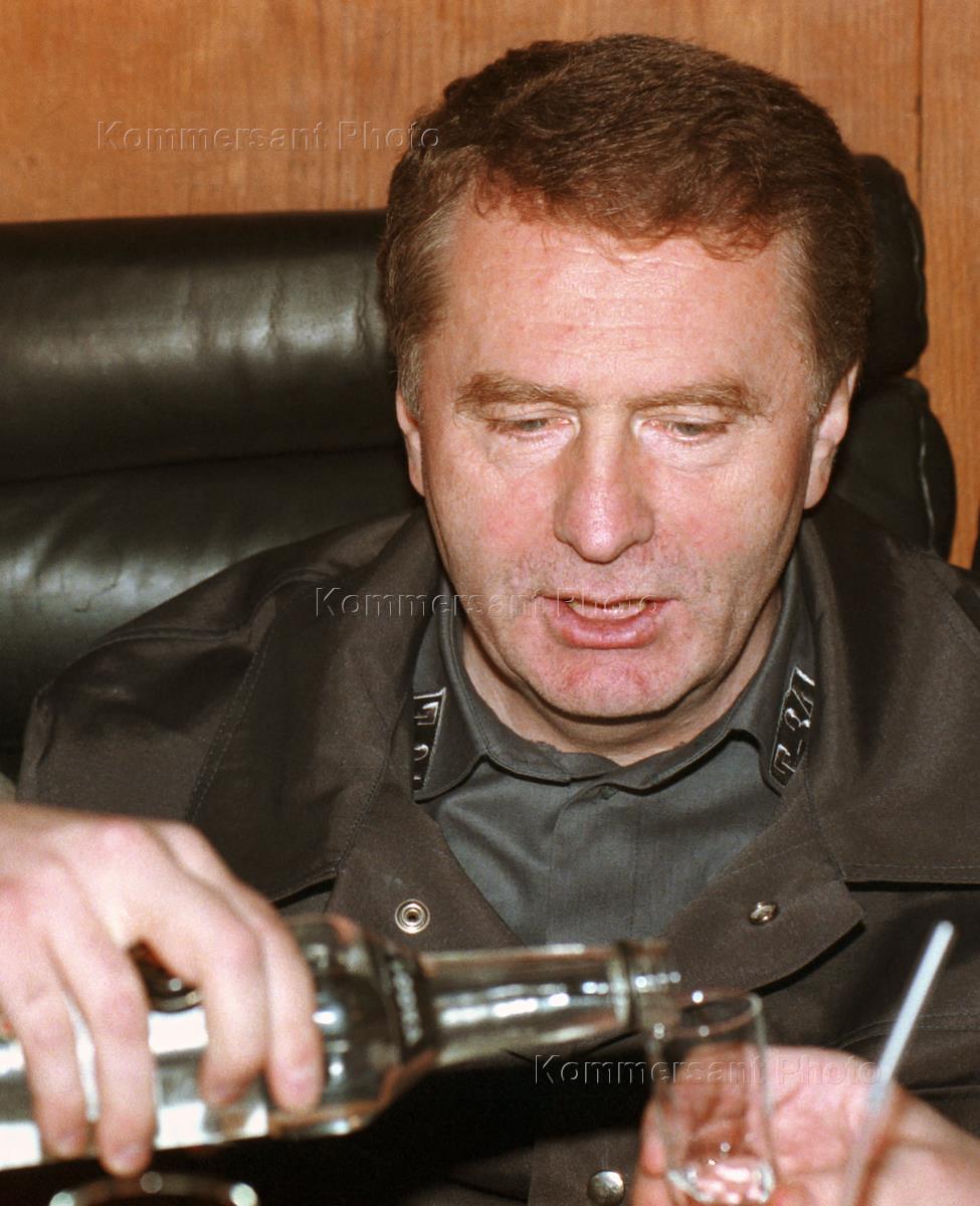Liberal and Democratic Party leader Vladimir Zhirinovsky pours vodka into his glass during a party dedicated the fashion show at the Dolls club.