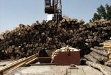 Деревообрабатывающий цех. Рабочий во время распила дерева.