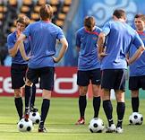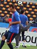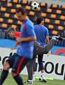 Главный тренер сборной России по футболу Гус Хиддинк (в центре) во время тренировки сборной команды России перед полуфинальным матчем со сборной Испании.