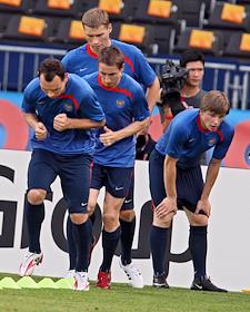 Футболисты Владимир Быстров (второй слева) и Андрей Аршавин (справа) на тренировке сборной команды России перед полуфинальным матчем со сборной Испании.