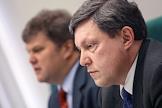 Председатель Российской объединенной демократической партии "Яблоко" Сергей Митрохин (слева) и член политического комитета Российской объединенной демократической партии "Яблоко" Григорий Явлинский (справа) на пресс-конференция "Новый председатель партии "Яблоко": наследство и возможности". Пресс-конференция прошла в агентстве "Интерфакс".
