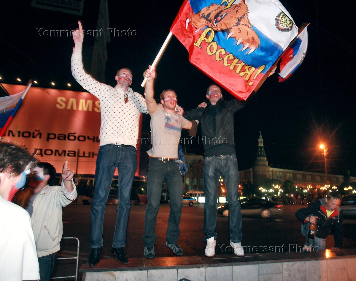 Массовое гулянье болельщиков на Манежной площади. Российская сборная по футболу завоевала бронзовые награды чемпионата Европы.