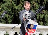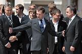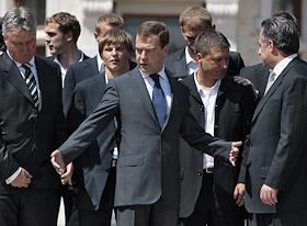 Главный тренер сборной команды России по футболу Гус Хиддинк (слева), футболист Андрей Аршавин (второй слева) и министр спорта, туризма и молодежной политики России Виталий Мутко (справа) во время встречи Президента России Дмитрия Медведева (в центре) с игроками сборной России по футболу. Встреча прошла в подмосковной президентской резиденции в Барвихе.