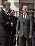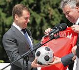 Главный тренер сборной команды России по футболу Гус Хиддинк (слева) во время встречи Президента России Дмитрия Медведева (справа) с игроками сборной России по футболу. Встреча прошла в подмосковной президентской резиденции в Барвихе.