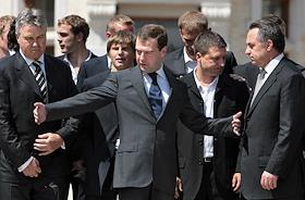 Президент России Дмитрий Медведев во время встречи с игроками сборной России по футболу. Встреча прошла в подмосковной президентской резиденции в Барвихе.