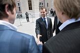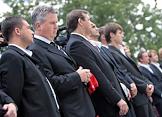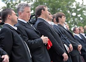 Главный тренер сборной команды России по футболу Гус Хиддинк (слева) и министр спорта, туризма и молодежной политики России Виталий Мутко (справа) во время встречи Президента России Дмитрия Медведева (в центре) с игроками сборной России по футболу. Встреча прошла в подмосковной президентской резиденции в Барвихе.