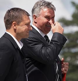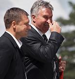Главный тренер сборной команды России по футболу Гус Хиддинк (справа) во время встречи Президента России Дмитрия Медведева (слева) с игроками сборной России по футболу. Встреча прошла в подмосковной президентской резиденции в Барвихе.