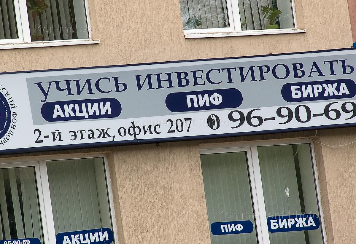 Жанровая фотография. Вывеска на фасаде бизнес-центра: "Учись инвестировать. Акции, ПИФ, биржа".