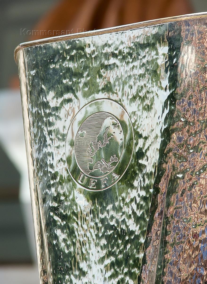 Гравировка UEFA на привезенном в Воронеж кубке УЕФА, завоеванном питерским клубом "Зенит" в мае 2008 года. Кубок был выставлен на всеобщее обозрение воронежским футбольным болельщикам возле здания драмтеатра.