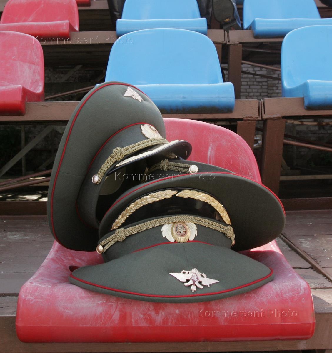 Соревнования по конкуру Открытого Кубка Вооруженных Сил Российской Федерации прошли на конно-спортивной базе ЦСКА. Военные фуражки на пустом кресле на трибуне.
