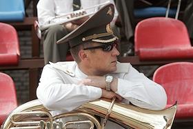 Соревнования по конкуру Отрытого Кубка Вооруженных Сил Российской Федерации прошли на конно-спортивной базе ЦСКА. Музыканты военного духового оркестра перед началом соревнований.
