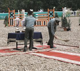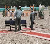 Соревнования по конкуру Отрытого Кубка Вооруженных Сил Российской Федерации прошли на конно-спортивной базе ЦСКА. Подготовка к церемонии награждения.
