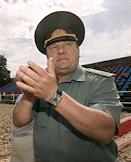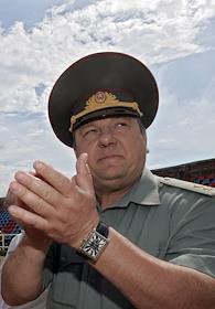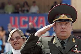 Соревнования по конкуру Открытого Кубка Вооруженных Сил Российской Федерации прошли на конно-спортивной базе ЦСКА. Советник министра обороны России Владимир Шаманов (слева) во время церемонии награждения победителей.