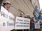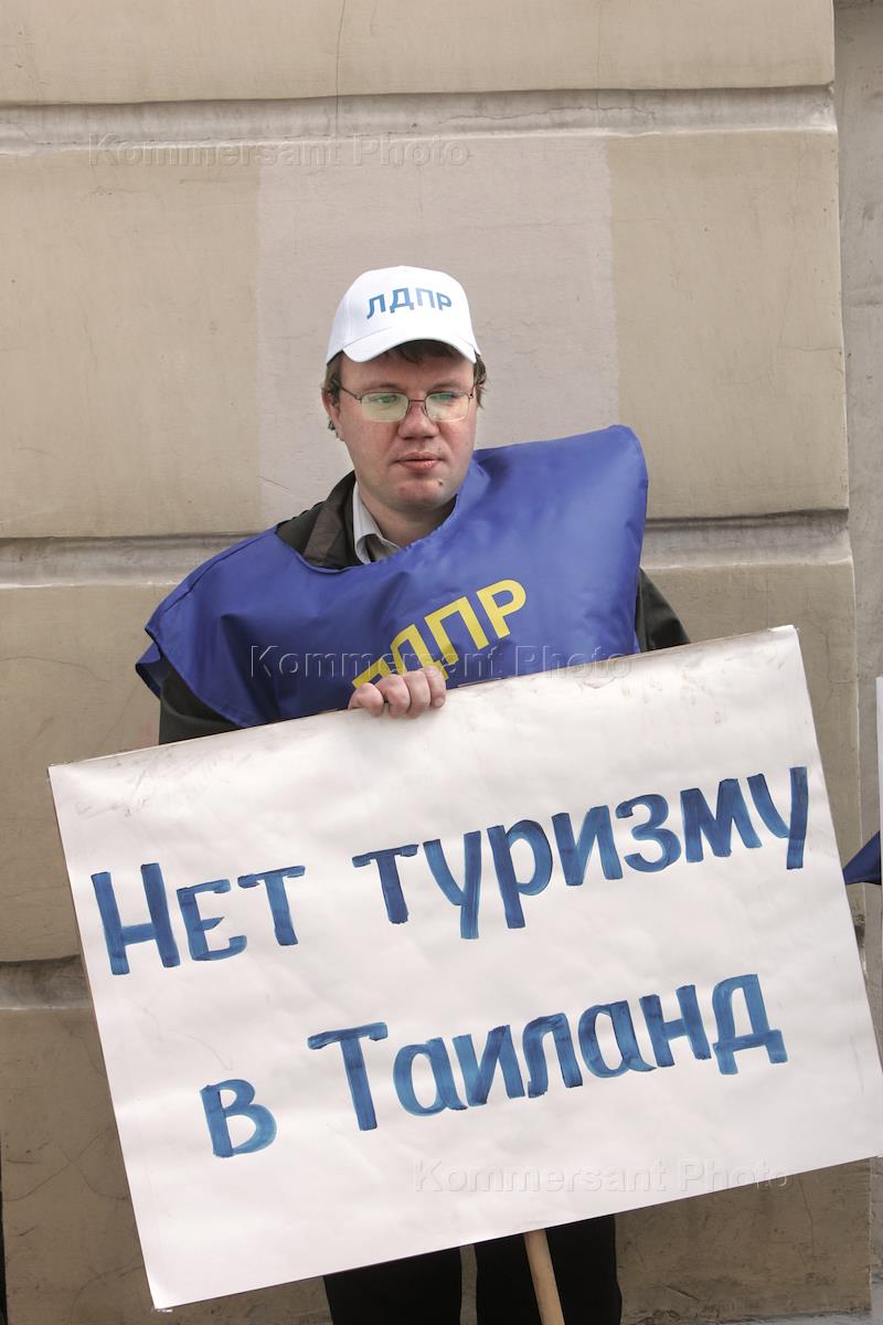Активисты ЛДПР провели митинг в поддержку арестованного в Тайланде предпринимателя Виктора Бута у посольства Тайланда. Участник митинга держит в руках плакат "Нет туризму в Таиланде".