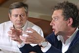 Советник шеф-редактора Издательского Дома "КоммерсантЪ" Алексей Кондратьев (слева) и предприниматель Александр Мамут (справа) во время встречи с журналистами Издательского Дома (ИД) "КоммерсантЪ". Встреча прошла в зале заседаний редколлегии ИД "КоммерсантЪ".