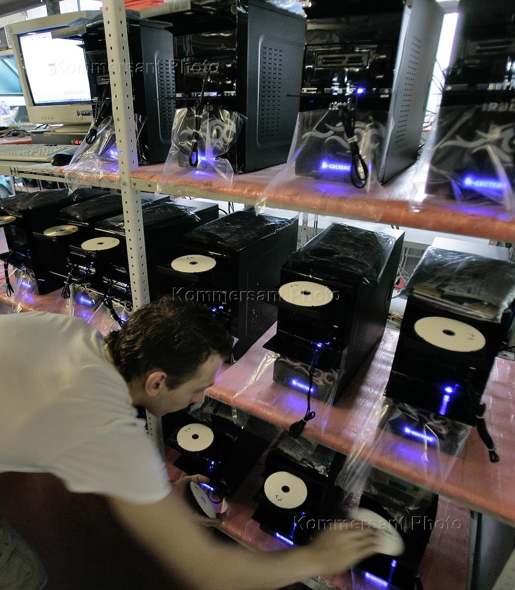 Производство по сборке компьютерного оборудования компании "К-Системс". Рабочий упаковывает готовую продукцию.