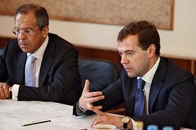 Президент России Дмитрий Медведев (справа) и министр иностранных дел России Сергей Лавров (слева) на совещании российских послов и постоянных представителей при международных организациях. Совещание прошло в министерстве иностранных дел России.