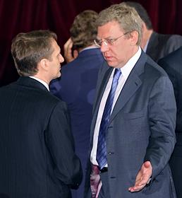 Руководитель администрации Президента России Сергей Нарышкин (слева) и министр финансов России Алексей Кудрин (справа) на совещании российских послов и постоянных представителей при международных организациях. Совещание прошло в министерстве иностранных дел России.
