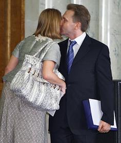 Мэр Москвы Юрий Лужков (слева) и помощник Президента России по вопросам образования и науки Джахан Поллыева (справа) на совещании российских послов и постоянных представителей при международных организациях. Совещание прошло в министерстве иностранных дел России.
