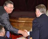 Руководитель Федеральной таможенной службы России Андрей Бельянинов (слева) и президент ОАО "Российские железные дороги" (РЖД) Владимир Якунин (справа) на совещании российских послов и постоянных представителей при международных организациях. Совещание прошло в министерстве иностранных дел России.