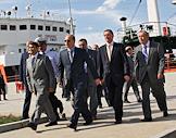 Председатель Правительства России Владимир Путин (второй слева), его заместитель Сергей Иванов (второй справа) и министр транспорта России Игорь Левитин (слева), полномочный представитель Президента России в Южном Федеральном округе Владимир Устинов (третий справа) и губернатор Ростовской области Владимир Чуб (справа) перед совещанием по вопросам комплексного использования водных ресурсов посетили Кочетовский гидроузел.