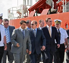 Председатель Правительства России Владимир Путин (слева), его заместитель Сергей Иванов (второй справа) и министр транспорта России Игорь Левитин (второй слева) перед совещанием по вопросам комплексного использования водных ресурсов посетили Кочетовский гидроузел.