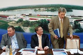 Полномочный представитель Президента России в Южном Федеральном округе Владимир Устинов (слева), заместитель председателя Правительства России Сергей Иванов (в центре) и пресс-секретарь Правительства России Дмитрий Песков (справа) на совещании по вопросам комплексного использования водных ресурсов. Совещание прошло в Кочетовском гидроузле.