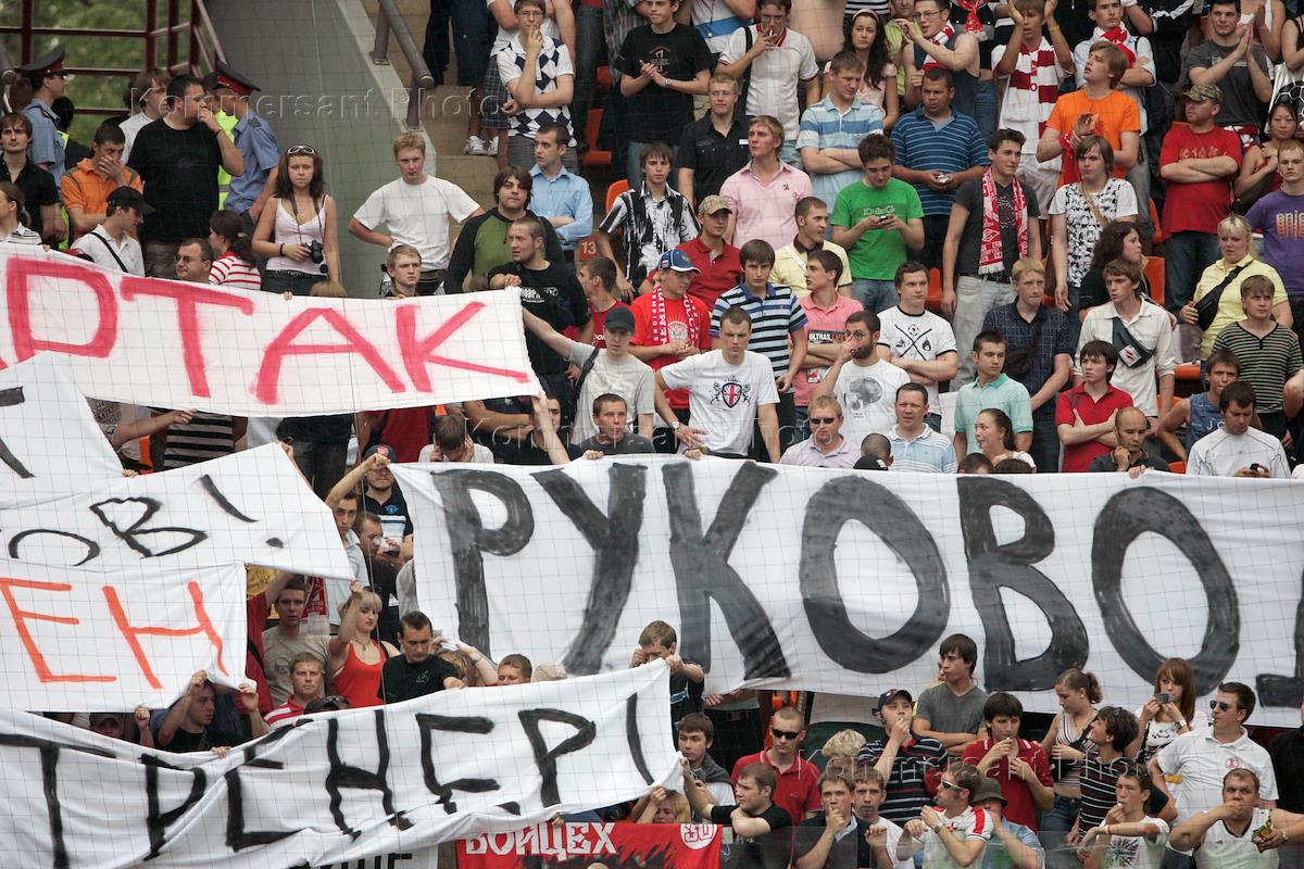 Чемпионат России по футболу. 14 тур. Болельщики на трибуне во время матча между командами "Локомотив"(Москва) - "Спартак"(Москва). Матч прошел на стадионе "Локомотив".