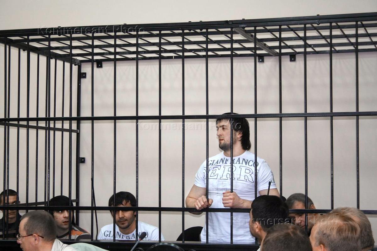 Очередное слушание дела по драке в кондопожском ресторане "Чайка". Обвиняемые Асламбек Баканаев (слева), Герихан Магомадов (в центре), Ислам Магомадов (второй справа) и Магомед Камилов (справа) на скамье подсудимых.