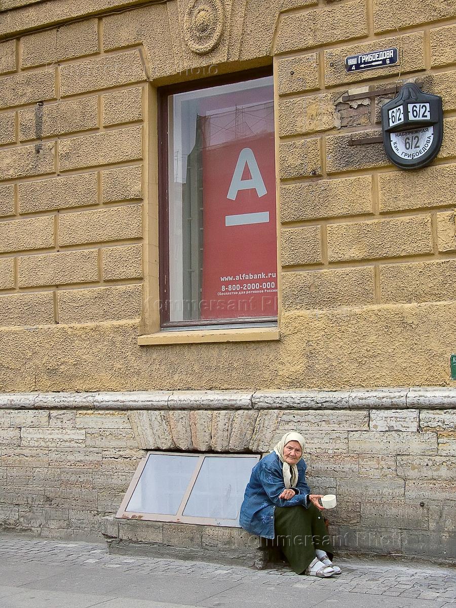 [English translation in progress (2)] The grandmother the pensioner begs from passers-by near a building "Alpha-bank" in St.-Petersburg.