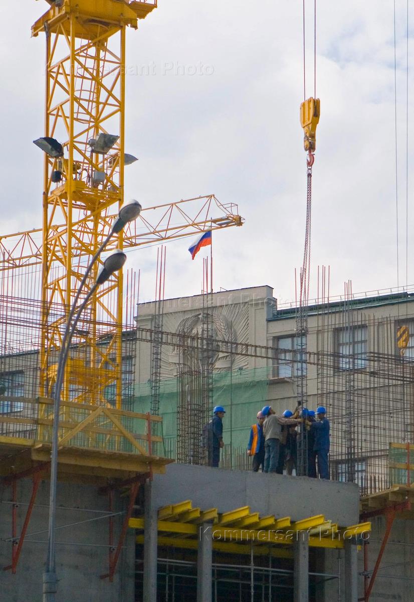 Строительство гостиницы "Москва". Реклама строительной фирмы "Strabag" на фоне здания Государственной Думы.
