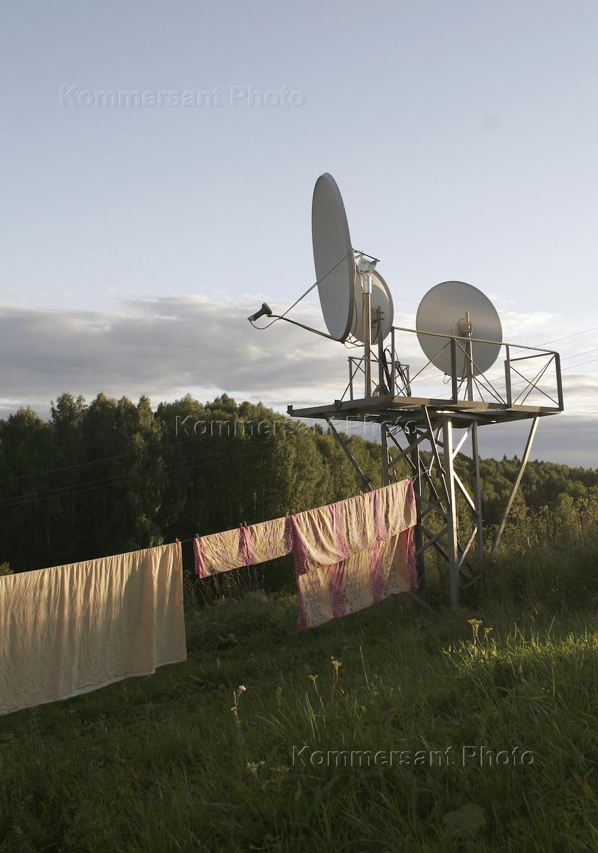 Мачта со спутниковыми антеннами и постельное белье сушится.