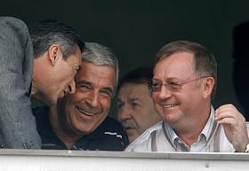 Чемпионат России по футболу. 15 Тур. Первый заместитель председателя Комитета Государственной Думы России по энергетике Валерия Драганов (слева), госсекретарь Союза России и Белоруссии Павел Бородин (в центре) и председатель Счетной палаты России Сергей Степашин (справа) на трибуне болельщиков во время матча между командами "Динамо" (Москва) - "Зенит" (Санкт-Петербург)(1:0). Матч прошел на стадион "Динамо".