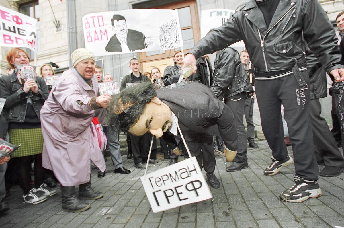 Митинг против вступления России во Всемирную торговую организацию, проводимый казачьим обществом "Станица" около Министерства экономического развития и торговли России. Участники митинга сжигают чучело министра экономического развития и торговли России Германа Грефа.