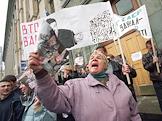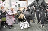 Митинг против вступления России во Всемирную торговую организацию, проводимый казачьим обществом "Станица" около Министерства экономического развития и торговли. Участники митинга с плакатами.