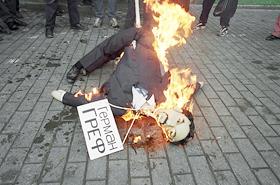Митинг против вступления России во Всемирную торговую организацию, проводимый казачьим обществом "Станица" около Министерства экономического развития и торговли. Участники митинга сжигают чучело министра экономического развития и торговли России Германа Грефа.