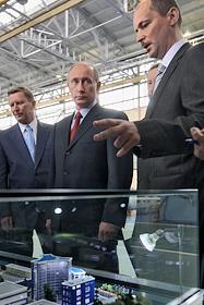 Председатель Правительства России Владимир Путин (в центре), генеральный директор "Концерна ПВО "Алмаз-Антей" Владислав Меньщиков (слева) и министр промышленности и торговли России Виктор Христенко (справа) во время посещения Московского машиностроительного завода "Авангард", который структурно входит в "Концерн ПВО "Алмаз-Антей".