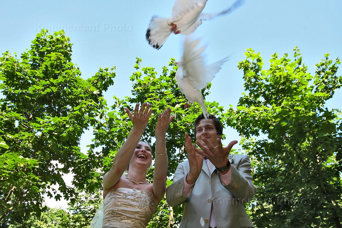 Свадебная церемония на Поклонной горе. Молодожены выпускают голубей.