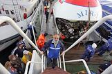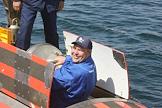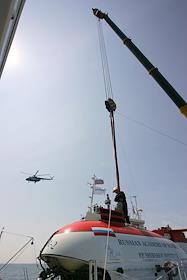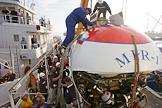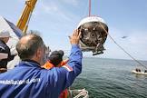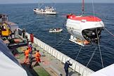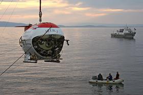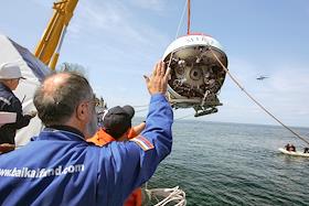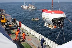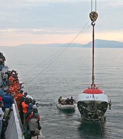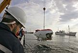 Научно-исследовательская экспедиция "Миры на Байкале", по изучению озера Байкал. Подъем глубоководного обитаемого аппарата (ГОА) "Мир-1" после погружения.
