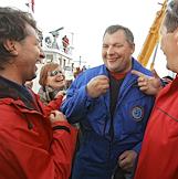 Руководитель экспедиции, член Комитета Государственной Дума России по обороне Артур Чилингаров (в центре) и генеральный директор ООО "Балтимор" Геннадий Терехов (справа) на борту корабля специального назначения "Метрополия" во время научно-исследовательской экспедиции, по изучению озера Байкал.