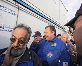 Член Комитета Государственной Дума России по обороне Артур Чилингаров (слева) и и генеральный директор ООО "Инвестиционная финансовая компания "МЕТРОПОЛЬ" Михаил Слипенчук (в центре) на борту корабля специального назначения "Метрополия" во время научно-исследовательской экспедиции, по изучению озера Байкал.