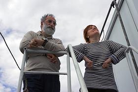 Член Комитета Государственной Дума России по обороне Артур Чилингаров (слева), председатель Комитета Государственной Думы России по природным ресурсам, природопользованию и экологии Наталья Комарова (справа) на борту корабля специального назначения "Метрополия" во время научно-исследовательской экспедиции, по изучению озера Байкал.