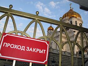 Жанровая фотография. Виды Москвы. На ограде у храма Христа Спасителя вывеска "проход закрыт".
