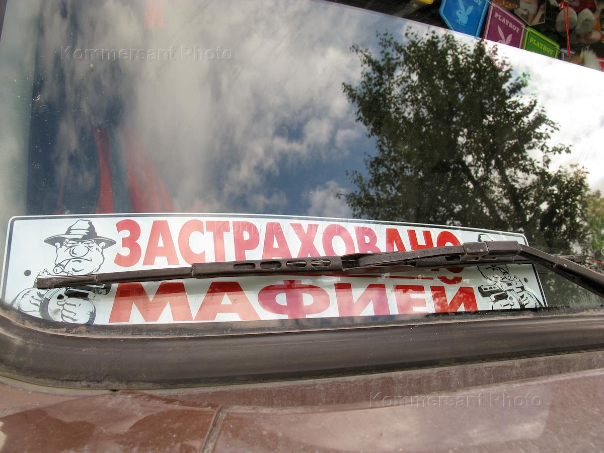 Жанровая фотография. Табличка на лобовом стекле автомобиля "Застрохованой мафией".