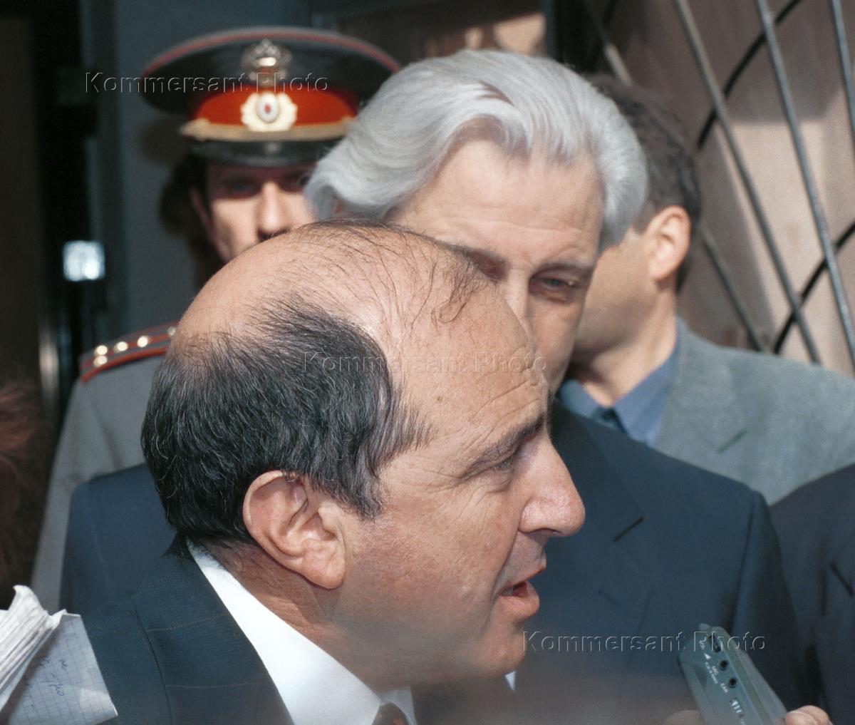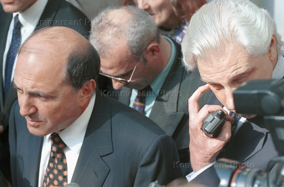 Предприниматель Борис Березовский и его адвокат Генри Резник (на втором плане) отвечают на вопросы журналистов перед зданием генеральной прокуратуры России.