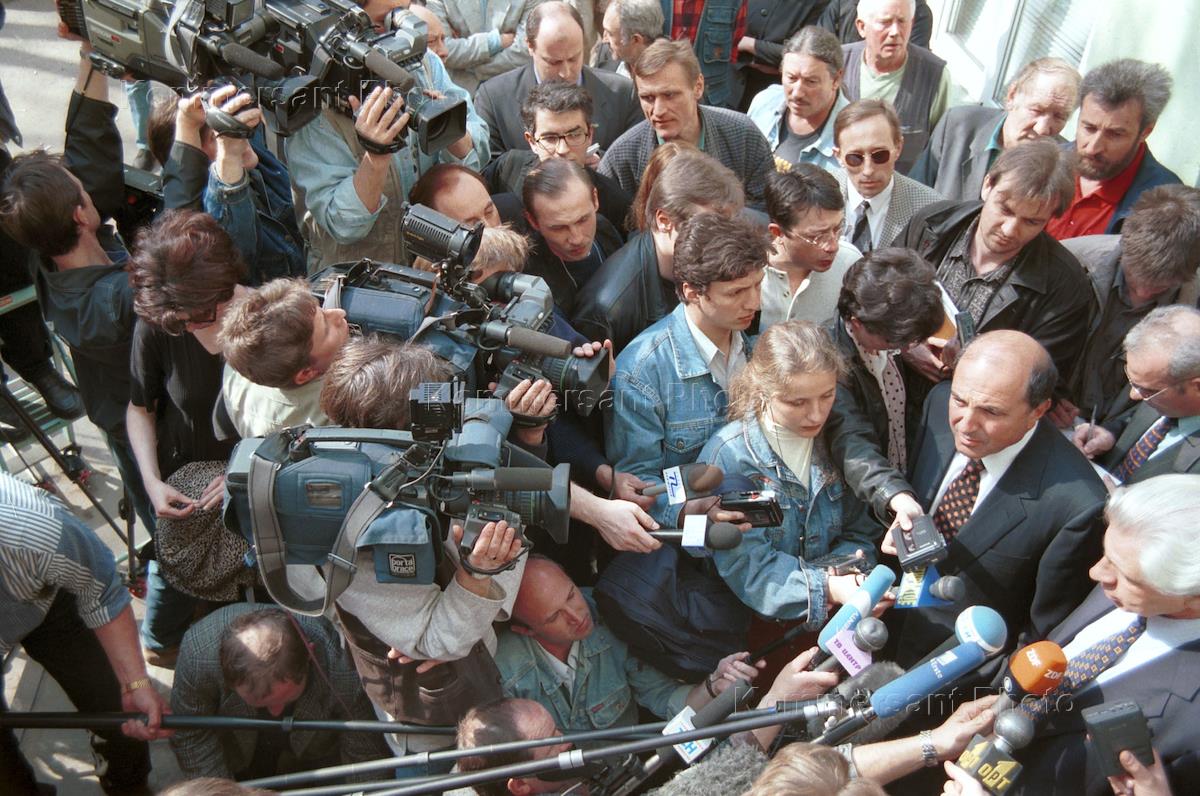 Businessman Boris Berezovsky (center) come out of the General Prosecutor Office. He is met by a disabled old man.