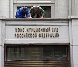 Рабочие устанавливают упавшую букву в вывеске над входом в здание Конституционного суда России.