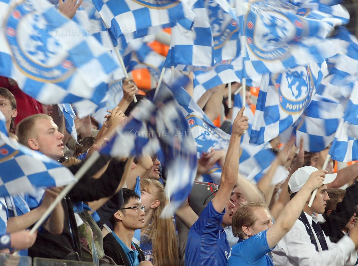 Кубок Российских железных дорог (РЖД) по футболу 2008. Трибуна болельщиков команды "Челси" во время матча между командами "Локомотив"(Россия)- "Челси"(Англия). Игра прошла на стадионе "Локомотив".